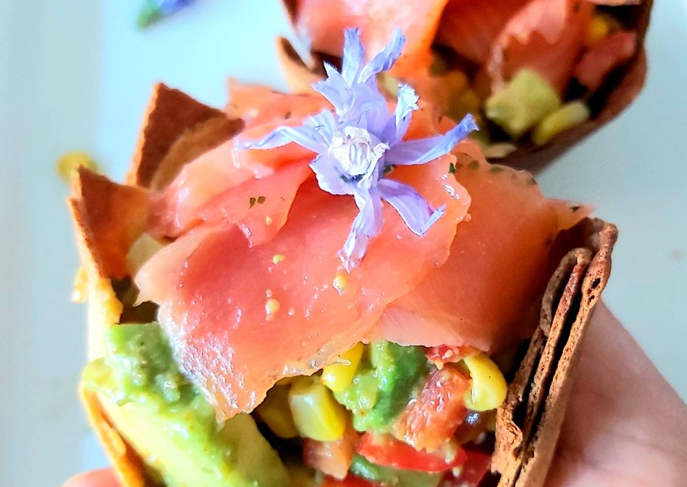 - Garnir les tortillas bowls, avec les garnitures et mini tranches de saumon fumé.