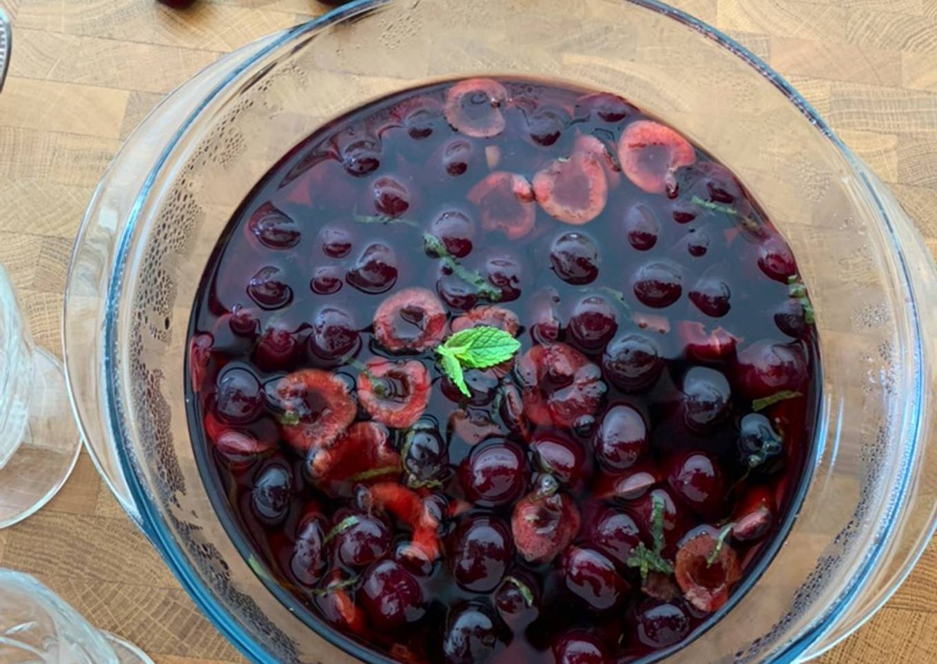 - Verser le sirop sur les cerises, et plonger la citronnelle pour la faire infuser. Attendre que ça refroidisse et laisser 1 nuit au frais.