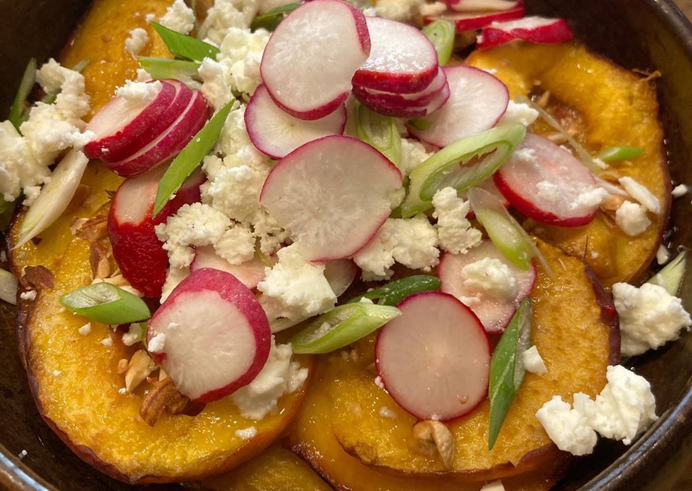- Versez un filet d’huile de noix sur les pêches et émiettez la fêta par-dessus ainsi que les rondelles de radis roses et ajoutez une pincée de sumac pour le « kick » d’acidité (ou un filet de jus de citron)