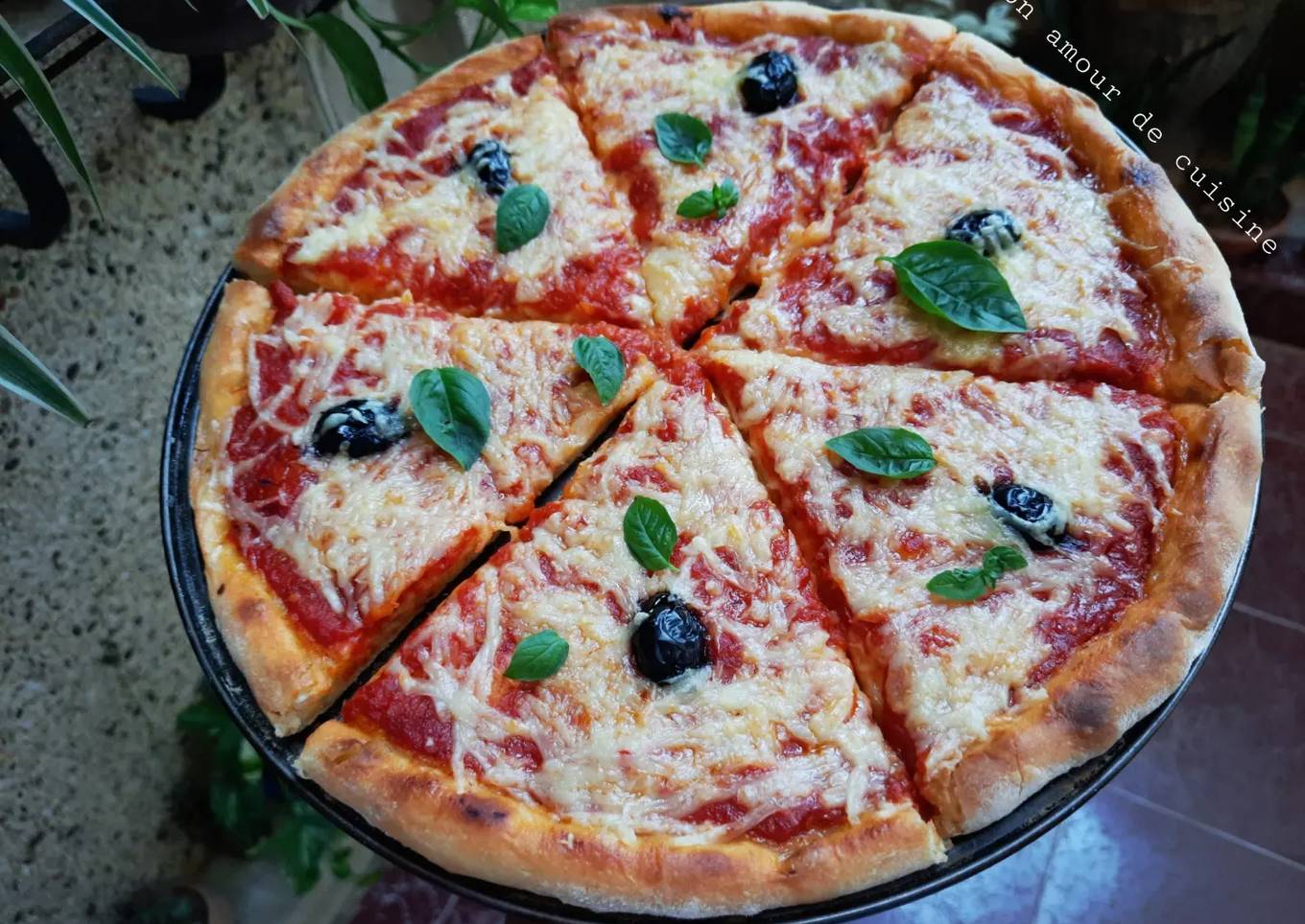 - Agrémentez la pizza de feuilles de basilic et dégustez avec une bonne boisson fraîche.