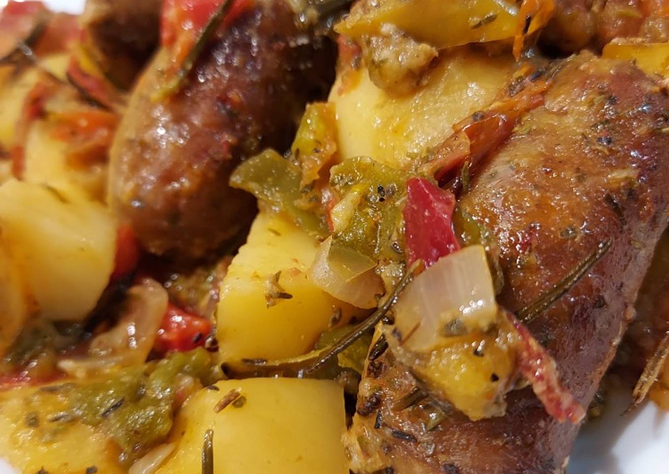 Instructions to make to make Saucisses pommes de terre, poivrons et tomates au four